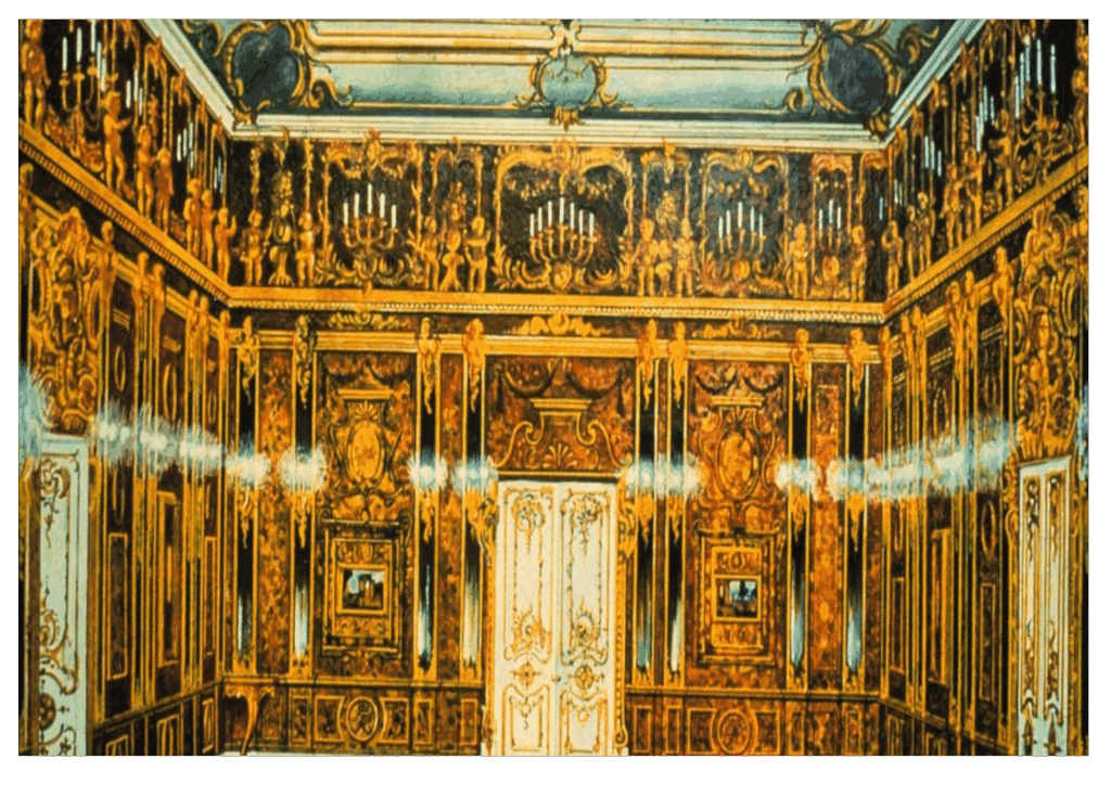 Bursztynowa komnata powstała w XVII wieku na zamówienie pruskiego króla Fryderyka I, który w 1716 r. podarował ją carowi Piotrowi I Wielkiemu. Trafiła do Petersburga, a następnie do Carskiego Sioła. W 1941 r. została zrabowana przez Niemców, zdemontowana i przewieziona do Królewca. W 1944 r. ponownie spakowano ją do skrzyń i umieszczono w zamkowych podziemiach – to ostatnia potwierdzona informacja o jej losach.