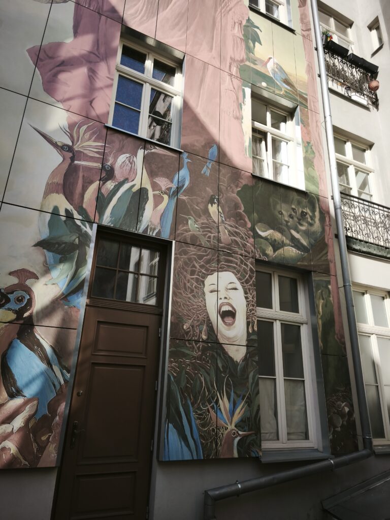 Architektoniczna skóra, którą pokryła artystka elewację podwórka jest odpowiednikiem siatkówki oka. Rozety symulują układy komórek nerwowych w siatkówce. Patrzenie stało się źródłem namysłu i obiektem fascynacji, a widzenie zostało sprowadzone do fenomenu fizjologicznego odbioru obrazu. Pasaż Róży to podróż od niewidzenia do widzenia ” – informuje tablica przed wejściem do Pasażu róż.