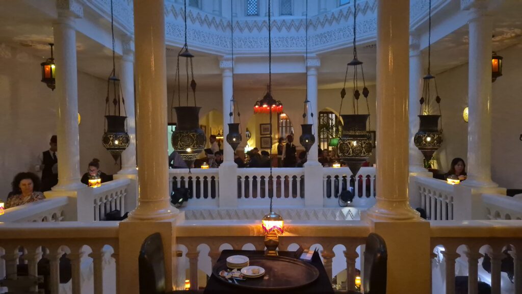 Miałam przyjemność być w środku. Willa położona jest blisko Oceanu, jej wejścia strzegą bramkarze – a wejść można tylko i wyłącznie jeśli zamówi się coś do jedzenia i picia. Jest niezwykle, bo to marokańskie wnętrze jest szczególnie estetyczne, w biało brązowych barwach. Tych koronek marokańskich na ścianach jest akurat w sam raz, bez przepychu tak jak w innych miejscach i nie tak kolorowe. To misteria wyjątkowa i delikatność. Przepiękne są marokańskie żyrandole – potężne, ażurowe kule, które w sposób czarodziejski rozpraszają światło. Ściany z oprawionymi zdjęciami i plakatami z filmu sprawiają wrażenie, że w nim grasz, jesteś częścią minionego czasu, bo ta restauracja tworzy iluzję. Osoba, z którą tam była miała łzy w oczach, gdy zabrzmiały dźwięki pięknej melodii z filmu – „ As time goes by” Maxa Steinera ( tego samego, który skomponował muzykę do „Przeminęło z wiatrem”) a przy fortepianie z lat 30-tych marki Player utwór grał czarnoskóry muzyk – tak jak w filmie. Po prostu bajka. Ludzi tam nie brakuje, można się uznać za szczęściarza, jeśli znajdzie się wolny stolik, bez wcześniejszej rezerwacji, bo ludzie spragnieni są takich miejsc,a cena nie gra roli, bo płacą za wspaniałe przeżycia, chwile, które zrośnięte są z wyjątkowymi, wartościowymi wydarzeniami i wyjątkowej estetyce ponieważ pragniemy podróżować w czasie.